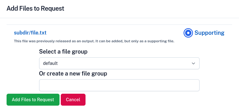 When you add a released file to a new request, only “Supporting” will be available as an option: